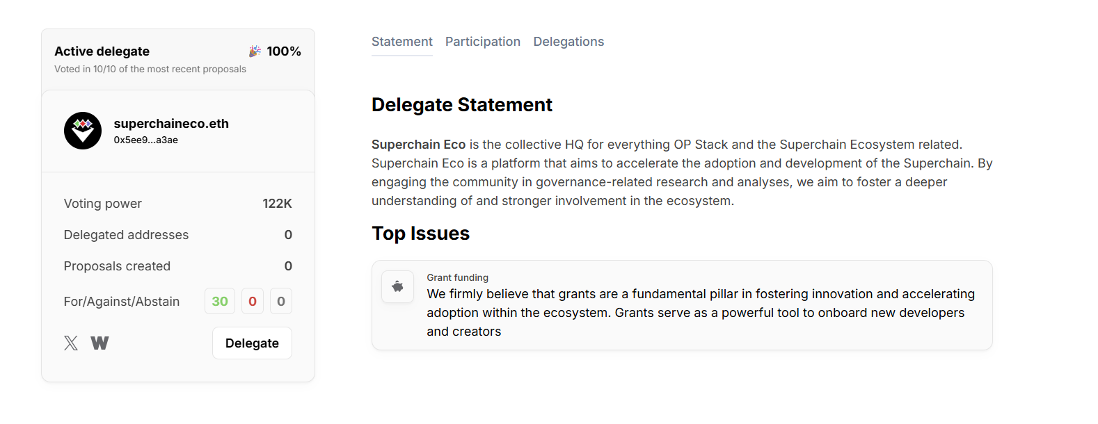 Consider [delegating your OP to Superchain Eco](https://vote.optimism.io/delegates/superchaineco.eth) if you want to help accelerate the vision of the Superchain Ecosystem.&#x20;